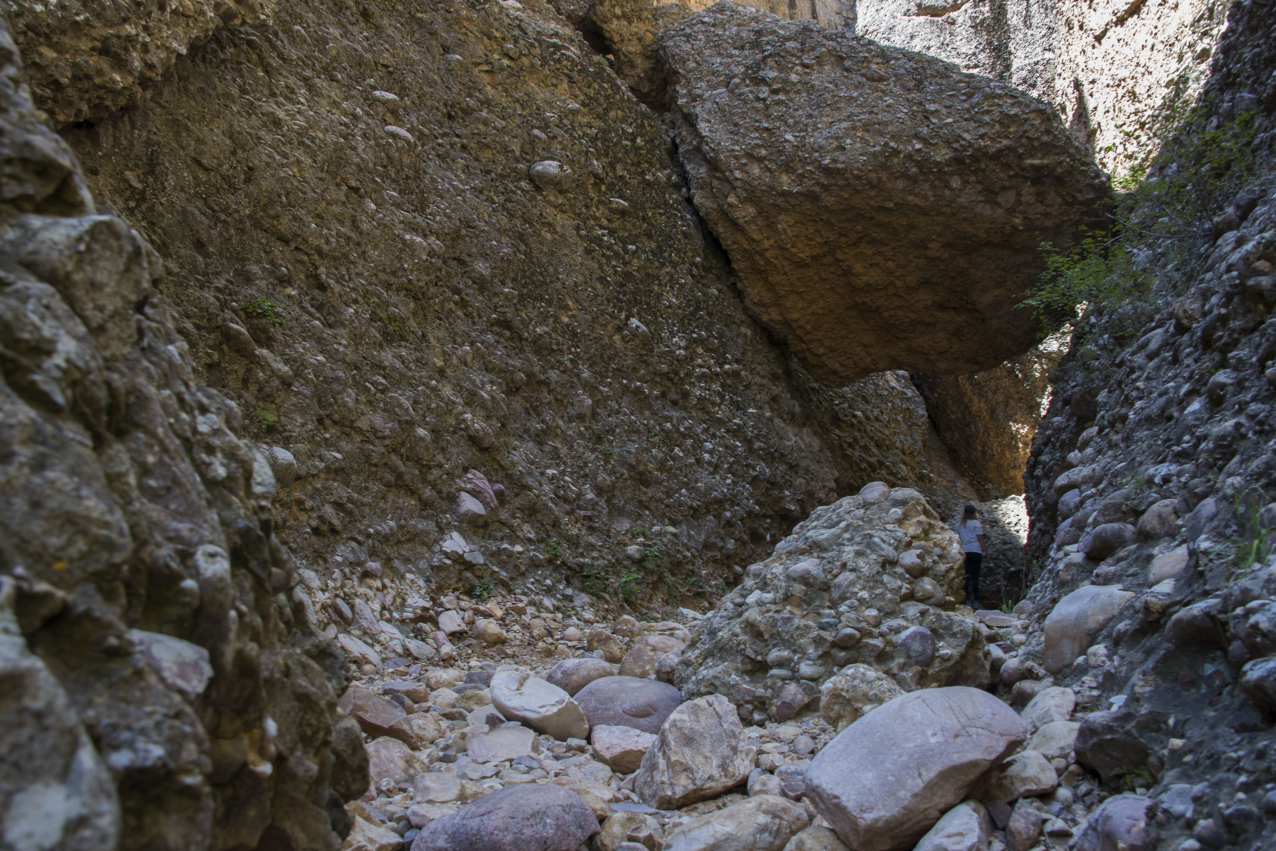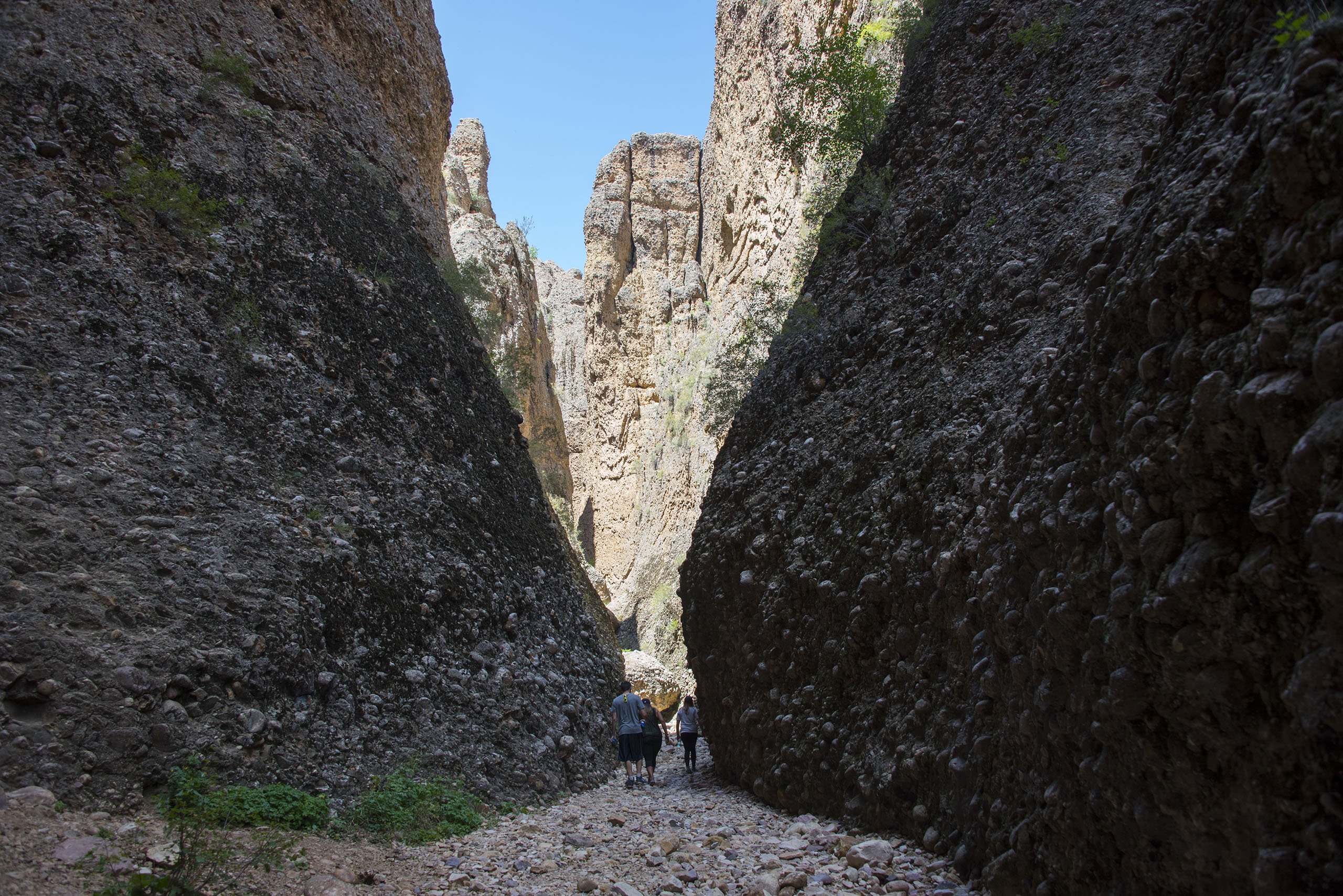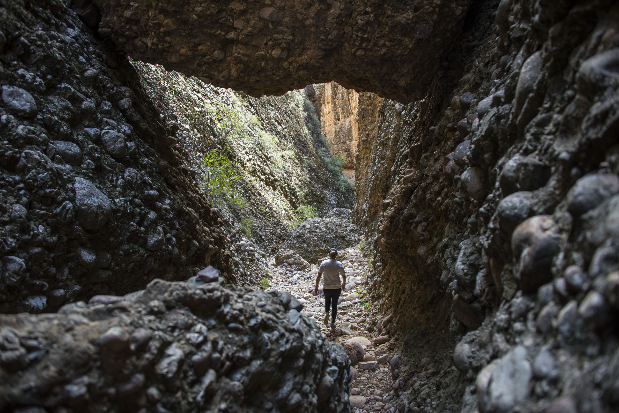 Box Canyon is just one of those remarkable places in this world that boggles your mind. As you maneuver your way through the canyon, conglomerate rock walls tower hundreds of feet above your head. Although it is technically a slot canyon, the base is as wide as 25 feet across at the base. In some places, the wall is not as steep, gradually sloping up to shallow caves in the canyon walls. These are a ton of fun to climb up to and explore. A majority of the hike is easy enough, but there are a few technical areas where rocks have fallen from the canyon wall in the past. Many of these boulders are easy enough to walk around or crawl under, but others require a bit of bouldering. Some of these spots can get tight, as you climb through cracks in the crumbled boulder. Don’t worry, there are ropes secured to the walls in a couple places to help you on your way up if you need them.