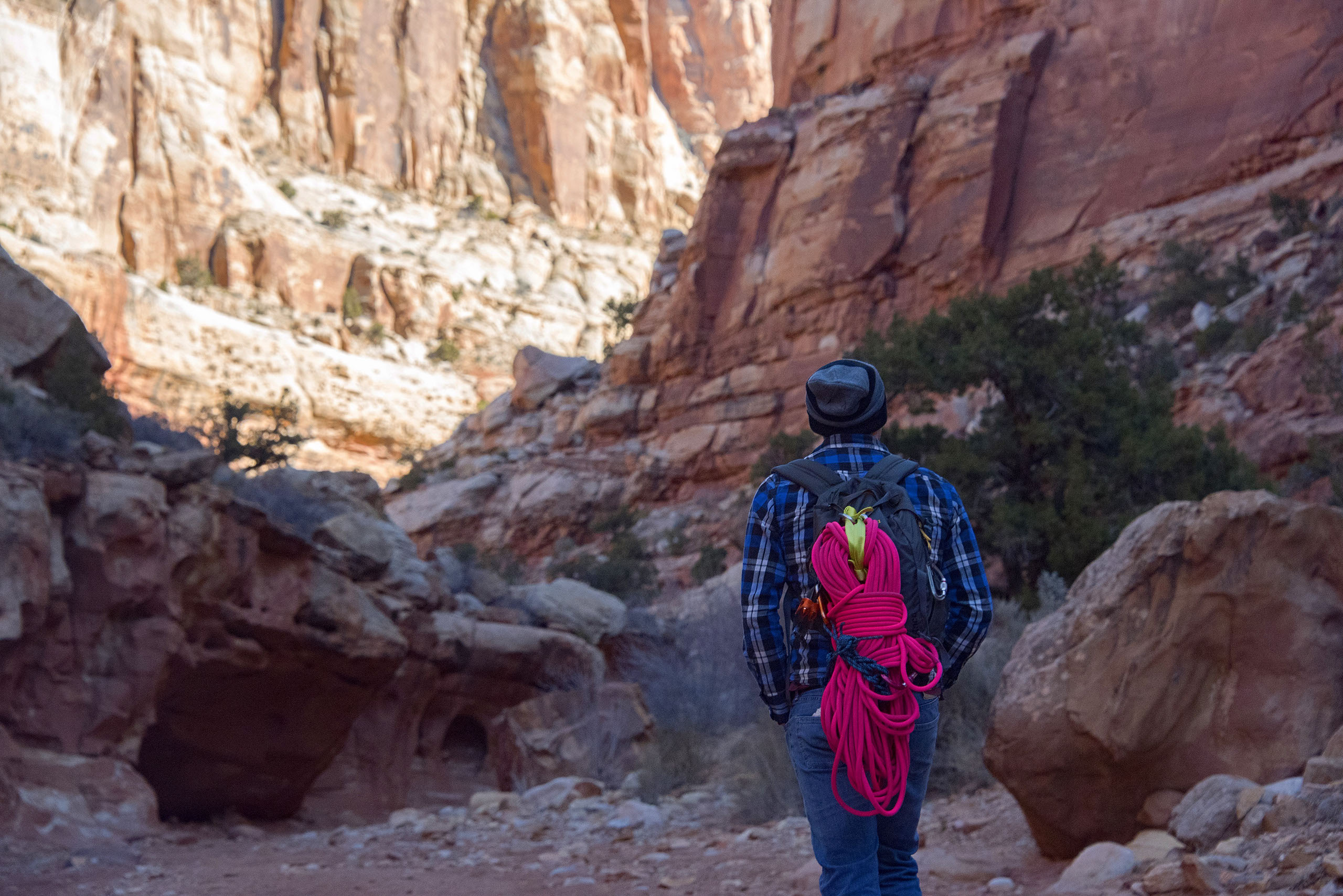 Once we reached the arch, we set up our anchor on the large pinyon pine to the side of the arch. This first rappel is the longest, at 140 feet. One of my favorite views throughout all of Cassidy Arch canyon was looking out to my right while making the descent. Looking down into the rest of the canyon and the journey we had ahead of us was incredible.